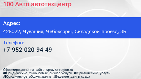 100 Авто, автотехцентр по адресу 428022, Чувашия, Чебоксары, Складской проезд, 3Б в дальнейшем Организация, размещена в следующих категориях:
