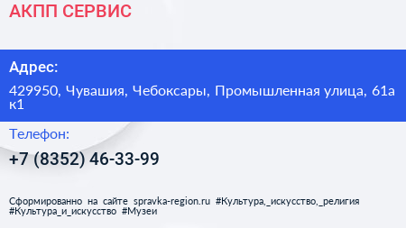 АКПП СЕРВИС по адресу 429950, Чувашия, Чебоксары, Промышленная улица, 61а к1 в дальнейшем Организация, размещена в следующих категориях: