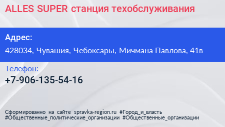 ALLES SUPER, станция техобслуживания по адресу 428034, Чувашия, Чебоксары, Мичмана Павлова, 41в в дальнейшем Организация, размещена в следующих категориях: