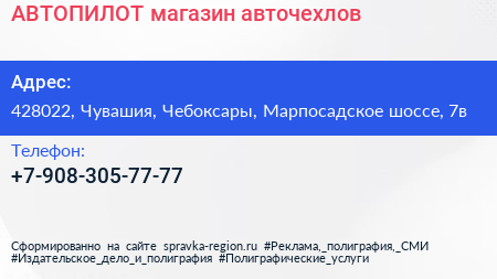 АВТОПИЛОТ, магазин авточехлов по адресу 428022, Чувашия, Чебоксары, Марпосадское шоссе, 7в в дальнейшем Организация, размещена в следующих категориях:
