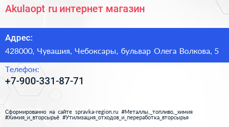Akulaopt.ru, интернет-магазин по адресу 428000, Чувашия, Чебоксары, бульвар Олега Волкова, 5 в дальнейшем Организация, размещена в следующих категориях: