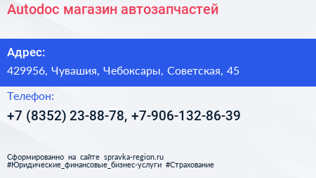 Autodoc, магазин автозапчастей по адресу 429956, Чувашия, Чебоксары, Советская, 45 в дальнейшем Организация, размещена в следующих категориях: