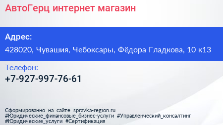 АвтоГерц, интернет-магазин по адресу 428020, Чувашия, Чебоксары, Фёдора Гладкова, 10 к13 в дальнейшем Организация, размещена в следующих категориях: