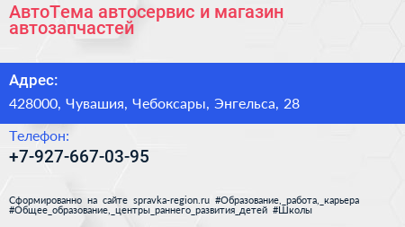 АвтоТема, автосервис и магазин автозапчастей по адресу 428000, Чувашия, Чебоксары, Энгельса, 28 в дальнейшем Организация, размещена в следующих категориях: