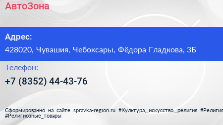 АвтоЗона по адресу 428020, Чувашия, Чебоксары, Фёдора Гладкова, 3Б в дальнейшем Организация, размещена в следующих категориях: