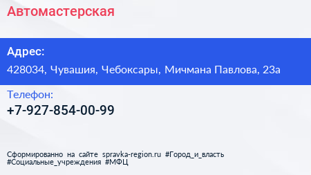 Автомастерская по адресу 428034, Чувашия, Чебоксары, Мичмана Павлова, 23а в дальнейшем Организация, размещена в следующих категориях: