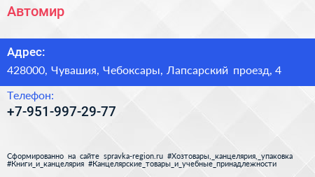 Автомир по адресу 428000, Чувашия, Чебоксары, Лапсарский проезд, 4 в дальнейшем Организация, размещена в следующих категориях: