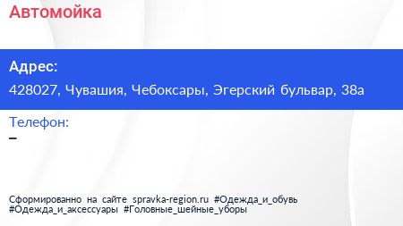 Автомойка по адресу 428027, Чувашия, Чебоксары, Эгерский бульвар, 38а в дальнейшем Организация, размещена в следующих категориях: