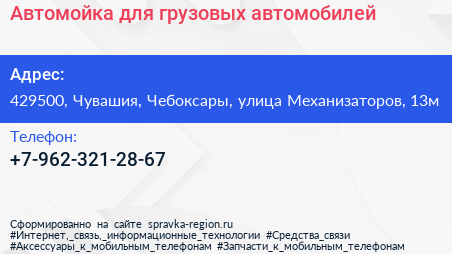 Автомойка для грузовых автомобилей по адресу 429500, Чувашия, Чебоксары, улица Механизаторов, 13м в дальнейшем Организация, размещена в следующих категориях:
