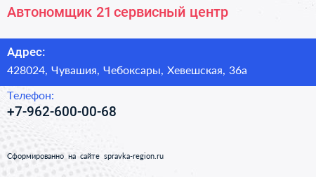 Автономщик 21, сервисный центр по адресу 428024, Чувашия, Чебоксары, Хевешская, 36а в дальнейшем Организация, размещена в следующих категориях: