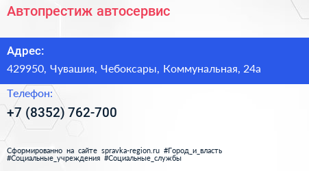 Автопрестиж, автосервис по адресу 429950, Чувашия, Чебоксары, Коммунальная, 24а в дальнейшем Организация, размещена в следующих категориях: