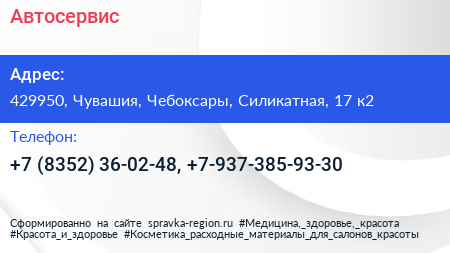 Автосервис по адресу 429950, Чувашия, Чебоксары, Силикатная, 17 к2 в дальнейшем Организация, размещена в следующих категориях: