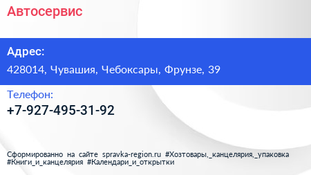 Автосервис по адресу 428014, Чувашия, Чебоксары, Фрунзе, 39 в дальнейшем Организация, размещена в следующих категориях: