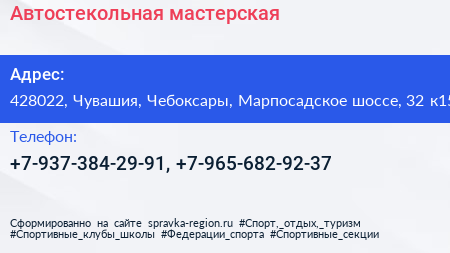 Автостекольная мастерская по адресу 428022, Чувашия, Чебоксары, Марпосадское шоссе, 32 к15 в дальнейшем Организация, размещена в следующих категориях: