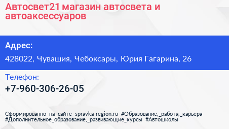 Автосвет21, магазин автосвета и автоаксессуаров по адресу 428022, Чувашия, Чебоксары, Юрия Гагарина, 26 в дальнейшем Организация, размещена в следующих категориях: