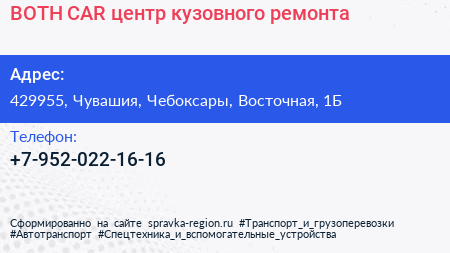 BOTH CAR, центр кузовного ремонта по адресу 429955, Чувашия, Чебоксары, Восточная, 1Б в дальнейшем Организация, размещена в следующих категориях: