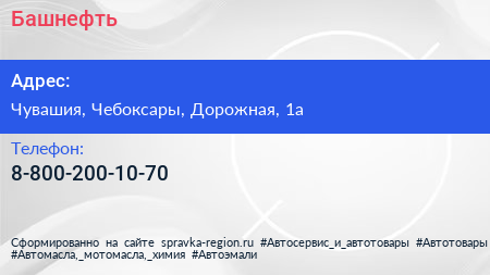 Башнефть по адресу Чувашия, Чебоксары, Дорожная, 1а в дальнейшем Организация, размещена в следующих категориях: