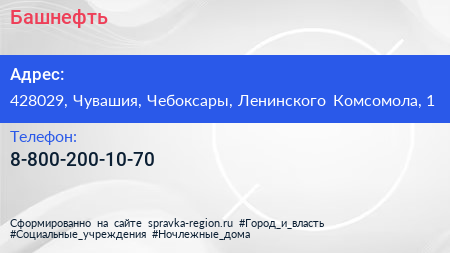 Башнефть по адресу 428029, Чувашия, Чебоксары, Ленинского Комсомола, 1 в дальнейшем Организация, размещена в следующих категориях: