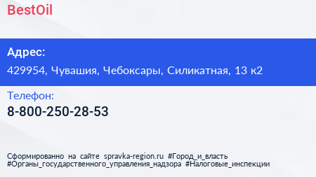 BestOil по адресу 429954, Чувашия, Чебоксары, Силикатная, 13 к2 в дальнейшем Организация, размещена в следующих категориях: