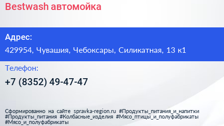 Bestwash, автомойка по адресу 429954, Чувашия, Чебоксары, Силикатная, 13 к1 в дальнейшем Организация, размещена в следующих категориях:
