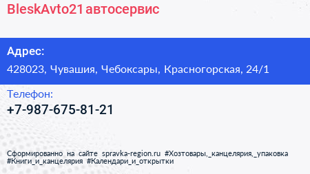 BleskAvto21, автосервис по адресу 428023, Чувашия, Чебоксары, Красногорская, 24/1 в дальнейшем Организация, размещена в следующих категориях:
