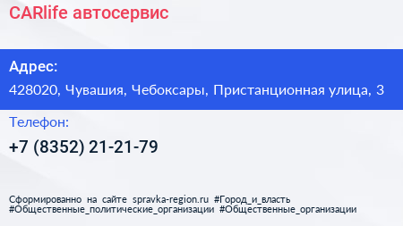 CARlife, автосервис по адресу 428020, Чувашия, Чебоксары, Пристанционная улица, 3 в дальнейшем Организация, размещена в следующих категориях: