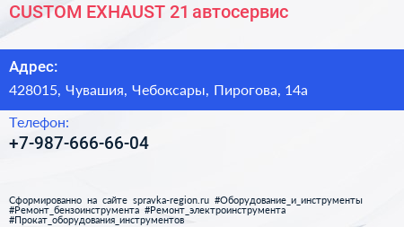 CUSTOM EXHAUST 21, автосервис по адресу 428015, Чувашия, Чебоксары, Пирогова, 14а в дальнейшем Организация, размещена в следующих категориях: