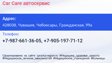 Car Care, автосервис по адресу 428038, Чувашия, Чебоксары, Гражданская, 99а в дальнейшем Организация, размещена в следующих категориях: