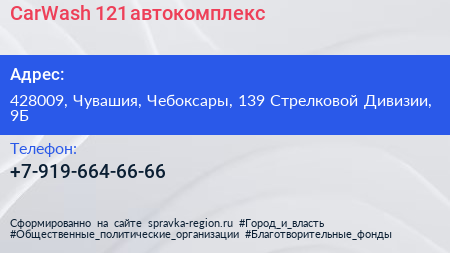 CarWash 121, автокомплекс по адресу 428009, Чувашия, Чебоксары, 139 Стрелковой Дивизии, 9Б в дальнейшем Организация, размещена в следующих категориях: