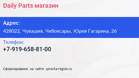 Daily-Parts, магазин по адресу 428022, Чувашия, Чебоксары, Юрия Гагарина, 26 в дальнейшем Организация, размещена в следующих категориях: