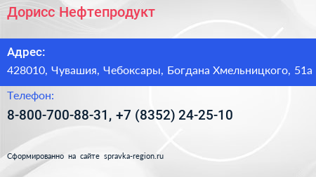 Дорисс-Нефтепродукт по адресу 428010, Чувашия, Чебоксары, Богдана Хмельницкого, 51а в дальнейшем Организация, размещена в следующих категориях: