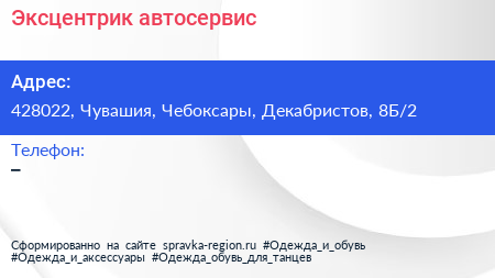 Эксцентрик, автосервис по адресу 428022, Чувашия, Чебоксары, Декабристов, 8Б/2 в дальнейшем Организация, размещена в следующих категориях: