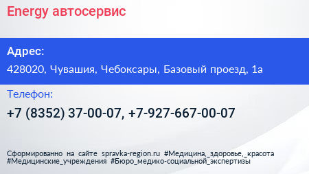 Energy, автосервис по адресу 428020, Чувашия, Чебоксары, Базовый проезд, 1а в дальнейшем Организация, размещена в следующих категориях:
