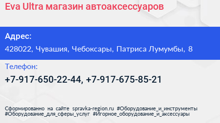 Eva Ultra, магазин автоаксессуаров по адресу 428022, Чувашия, Чебоксары, Патриса Лумумбы, 8 в дальнейшем Организация, размещена в следующих категориях: