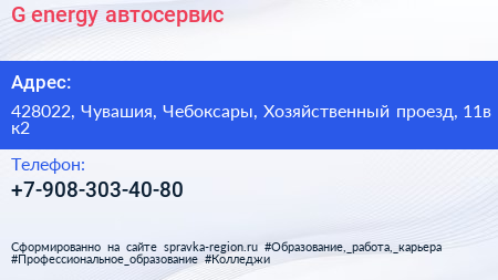 G-energy, автосервис по адресу 428022, Чувашия, Чебоксары, Хозяйственный проезд, 11в к2 в дальнейшем Организация, размещена в следующих категориях: