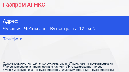Газпром, АГНКС по адресу Чувашия, Чебоксары, Вятка трасса 12 км, 2 в дальнейшем Организация, размещена в следующих категориях: