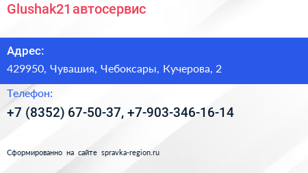 Glushak21, автосервис по адресу 429950, Чувашия, Чебоксары, Кучерова, 2 в дальнейшем Организация, размещена в следующих категориях: