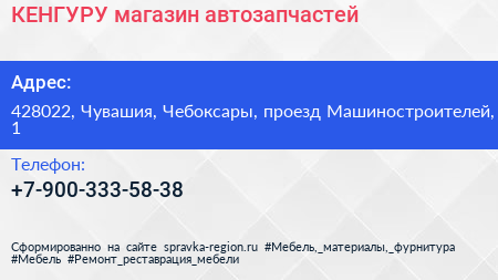 КЕНГУРУ, магазин автозапчастей по адресу 428022, Чувашия, Чебоксары, проезд Машиностроителей, 1 в дальнейшем Организация, размещена в следующих категориях: