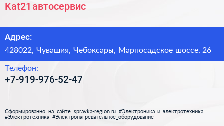 Kat21, автосервис по адресу 428022, Чувашия, Чебоксары, Марпосадское шоссе, 26 в дальнейшем Организация, размещена в следующих категориях:
