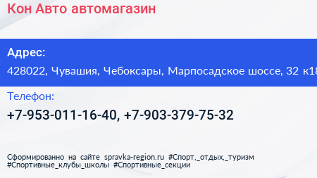 Кон-Авто, автомагазин по адресу 428022, Чувашия, Чебоксары, Марпосадское шоссе, 32 к18 в дальнейшем Организация, размещена в следующих категориях: