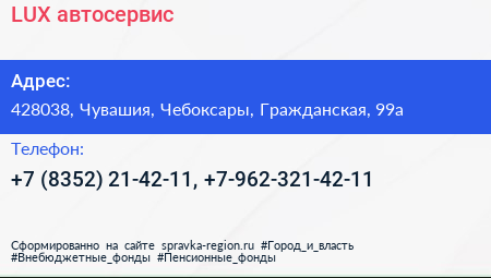LUX, автосервис по адресу 428038, Чувашия, Чебоксары, Гражданская, 99а в дальнейшем Организация, размещена в следующих категориях: