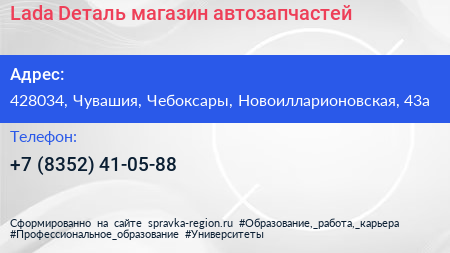 Lada Dеталь, магазин автозапчастей по адресу 428034, Чувашия, Чебоксары, Новоилларионовская, 43а в дальнейшем Организация, размещена в следующих категориях: