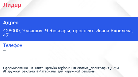 Лидер по адресу 428000, Чувашия, Чебоксары, проспект Ивана Яковлева, 47 в дальнейшем Организация, размещена в следующих категориях: