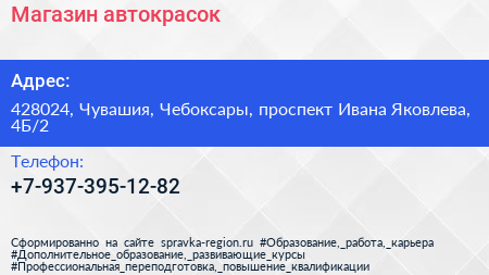 Магазин автокрасок по адресу 428024, Чувашия, Чебоксары, проспект Ивана Яковлева, 4Б/2 в дальнейшем Организация, размещена в следующих категориях: