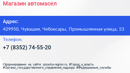 Магазин автомасел по адресу 429950, Чувашия, Чебоксары, Промышленная улица, 53 в дальнейшем Организация, размещена в следующих категориях: