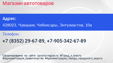 Магазин автотоваров по адресу 428023, Чувашия, Чебоксары, Энтузиастов, 10а в дальнейшем Организация, размещена в следующих категориях: