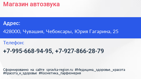 Магазин автозвука по адресу 428000, Чувашия, Чебоксары, Юрия Гагарина, 25 в дальнейшем Организация, размещена в следующих категориях:
