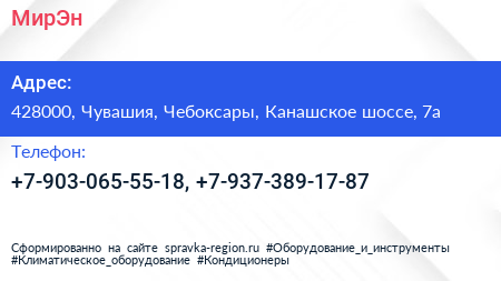 МирЭн по адресу 428000, Чувашия, Чебоксары, Канашское шоссе, 7а в дальнейшем Организация, размещена в следующих категориях: