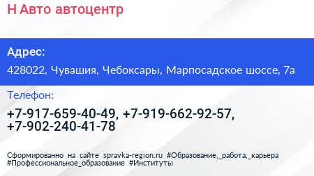 Н-Авто, автоцентр по адресу 428022, Чувашия, Чебоксары, Марпосадское шоссе, 7а в дальнейшем Организация, размещена в следующих категориях: