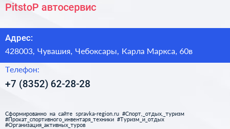 PitstoP, автосервис по адресу 428003, Чувашия, Чебоксары, Карла Маркса, 60в в дальнейшем Организация, размещена в следующих категориях: